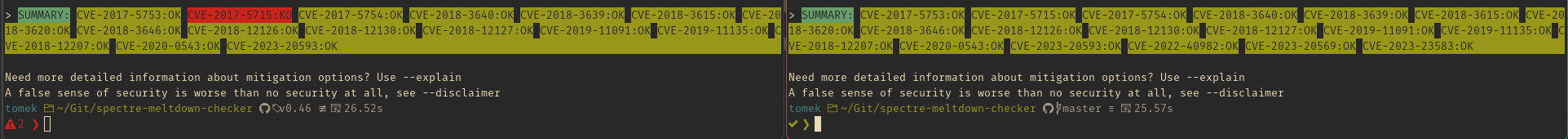 Jednak b. przydatny pakiet z AUR pokazał mi, że byłem w tym czasie wystawiony na potencjalną pastwę podatności Spectre v2. Poniższa komenda pokazała na czerwono, że mój system nie jest w pełni zabezpieczony przed zagrożeniem CVE-2017-5715.